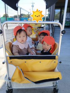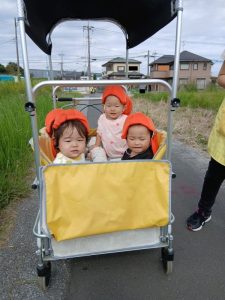 散歩中は猫じゃらしなどの自然物を手に持って、園舎周辺を散策することが多いです❗又、鳥を見つけた時に先生が「ことりの歌」を歌うと、手を叩いて嬉しそうにリズムに乗る様子があります😊